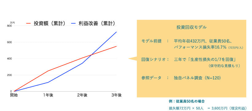人材に投下したコストのうち、成果につながっていない労働生産性の損失は、社員1人あたり72万円と報告されています(横浜市と東大の共同調査より)。